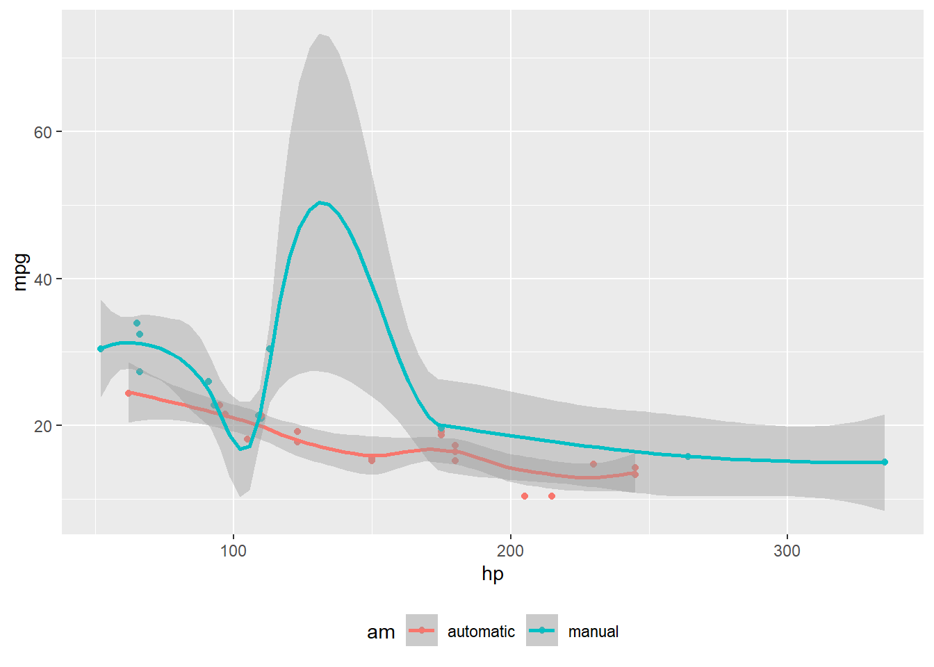 Figure 1: MPG vs horsepower, colored by transmission.